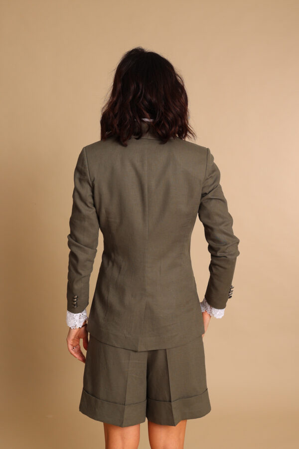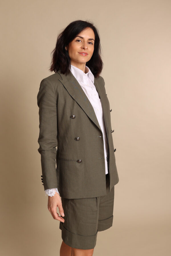 Blazer doppiopetto con revers a lancia in prezioso lino color verde militare con originali bottoni in bronzo fumè. Sono disponibili sia il bermuda che il pantalone a sigaretta nello stesso tessuto.
