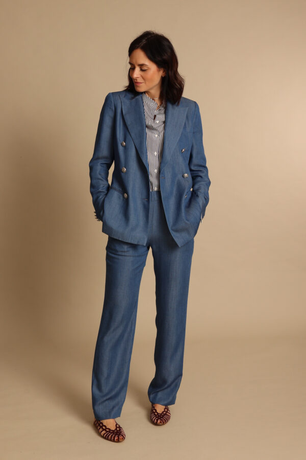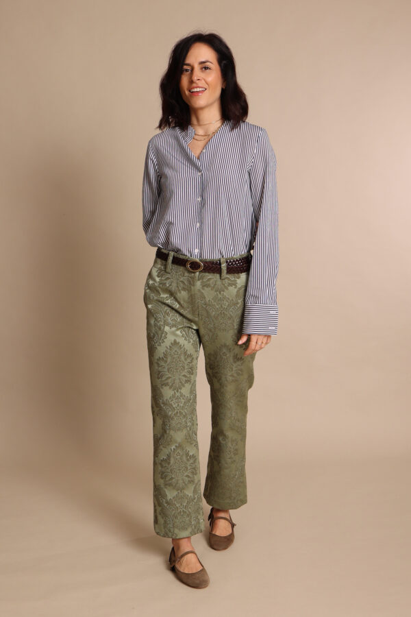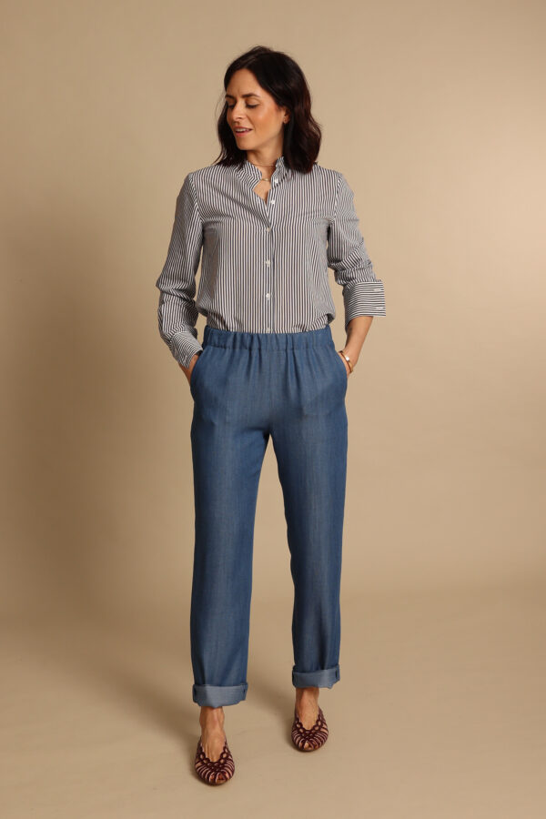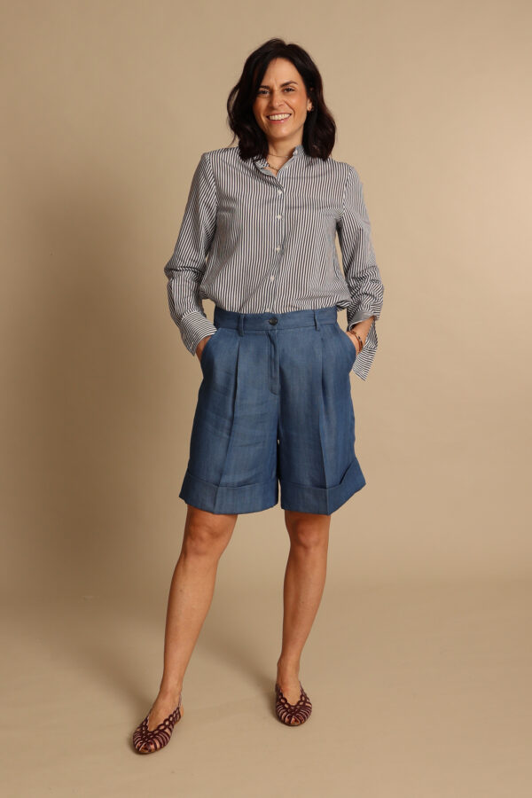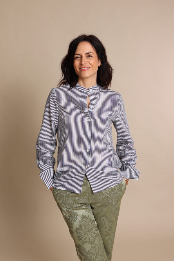 Camicia con colletto alla coreana e bottoncini madreperla a righine bianche e blu.