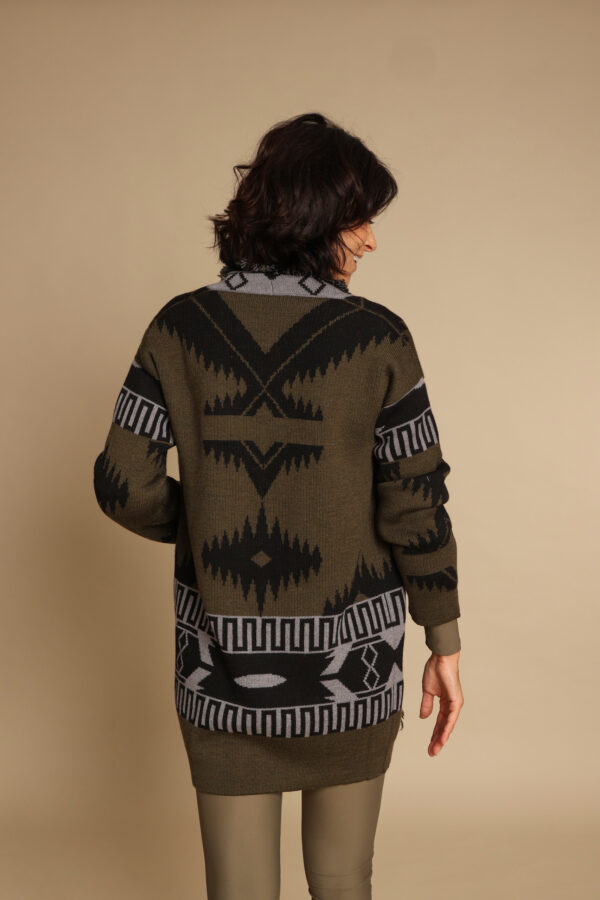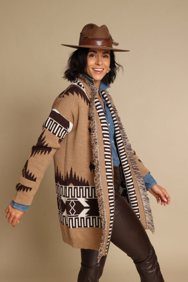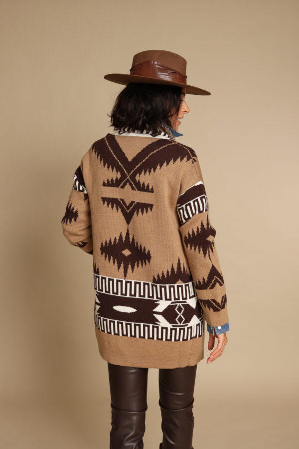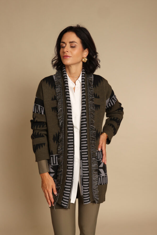 Cardigan in lana merino con lavorazione jacquard, perfetto anche come cappottino. Un capo caldo, prezioso e di grande stile.