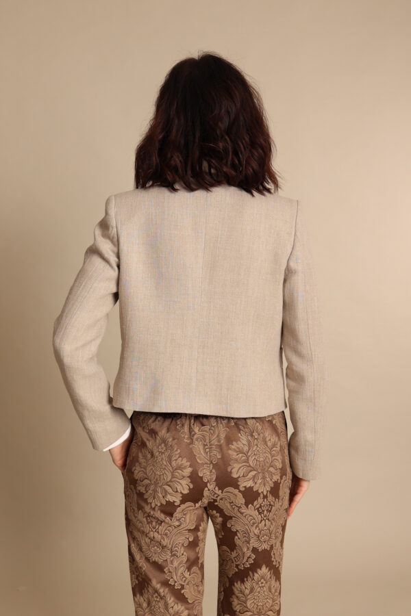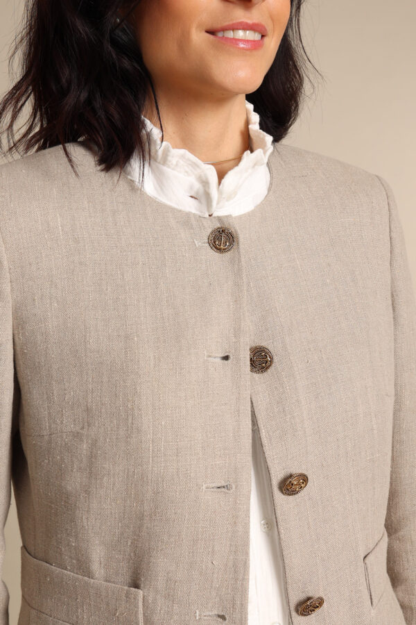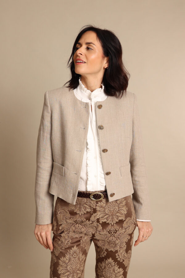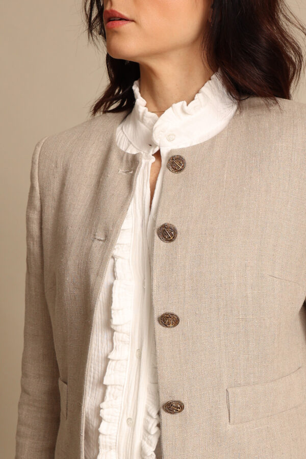 Giacca modello chanel in un prezioso lino naturale. I meravigliosi ed originali bottoni con ancora dorata la rendono un capo davvero speciale che profuma d’ estate.