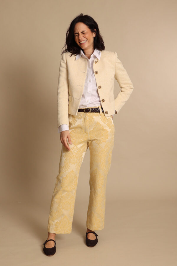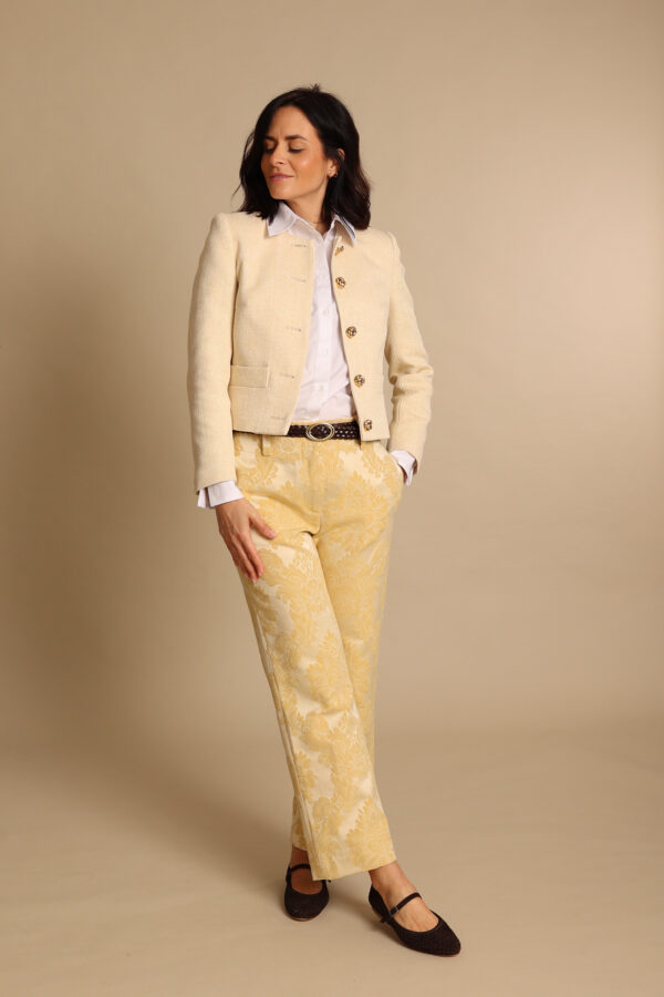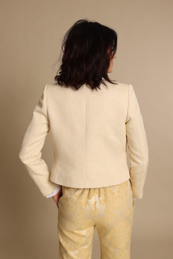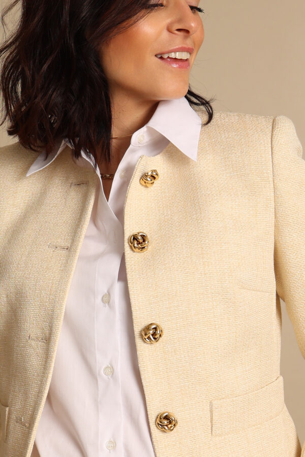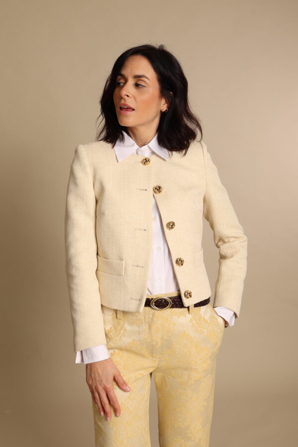 Giacca modello chanel in un prezioso lino butter yellow. I meravigliosi ed originali bottoni con nodo dorato la rendono un capo davvero speciale.