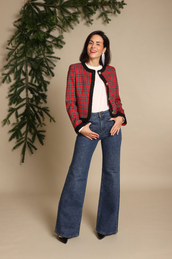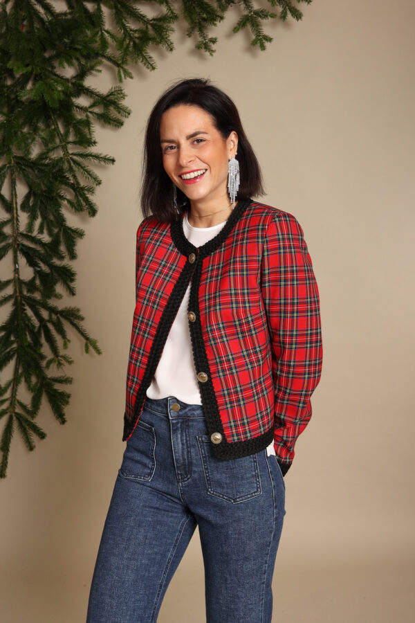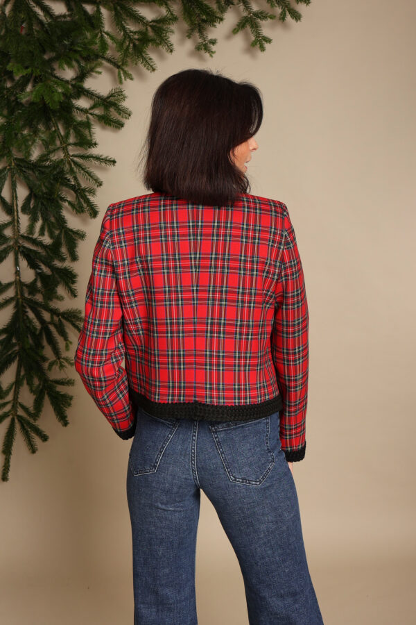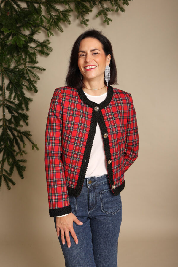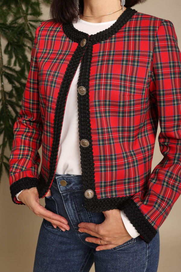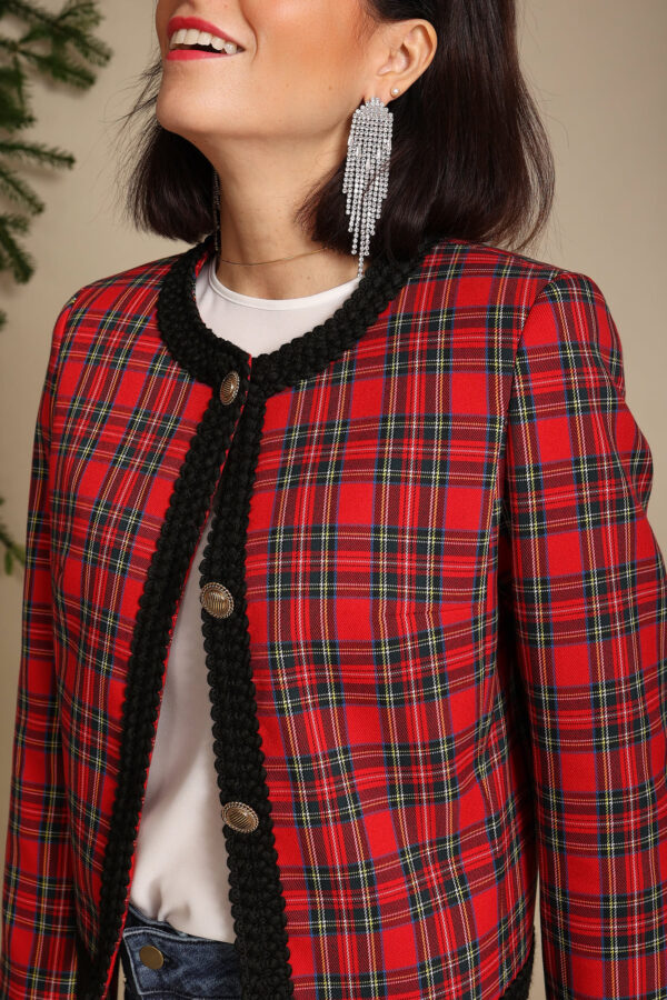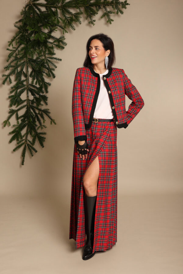 Giacca chanel in tartan rosso, con bottoni gioiello dorati e passamaneria in lana applicata a mano. Il completo è disponibile con pantaloncino o gonna lunga.