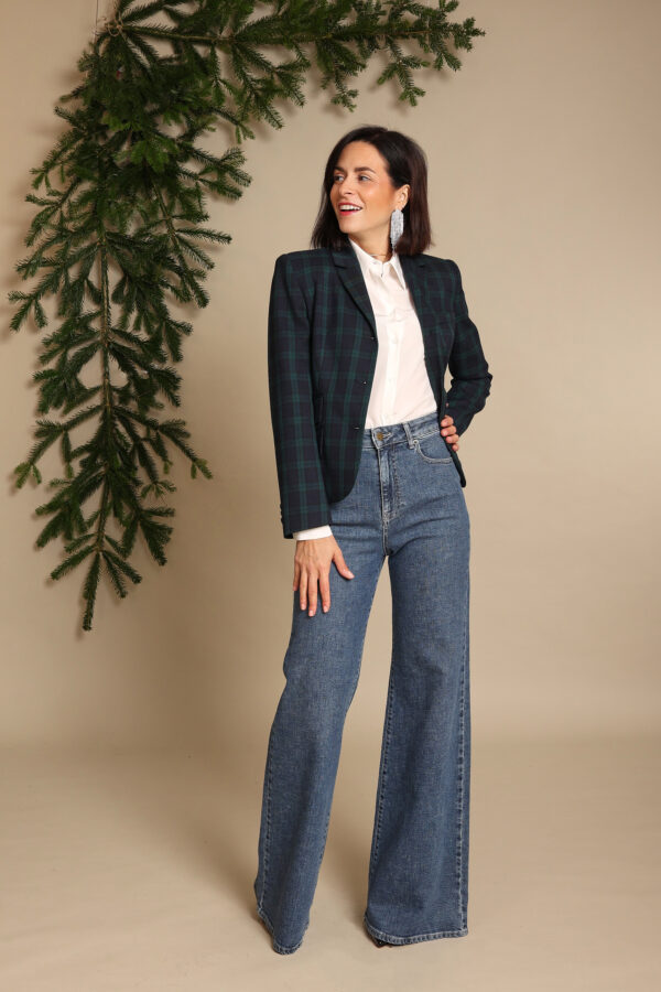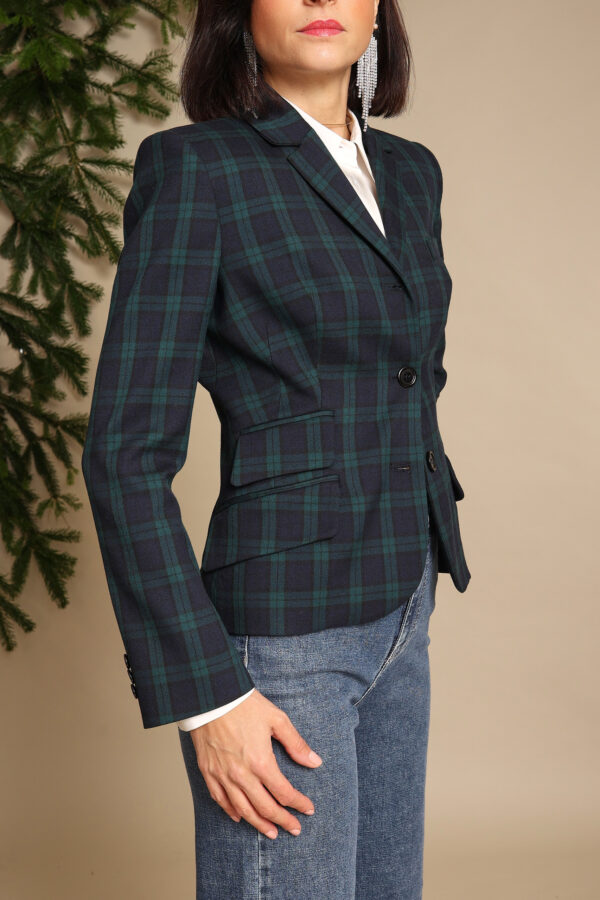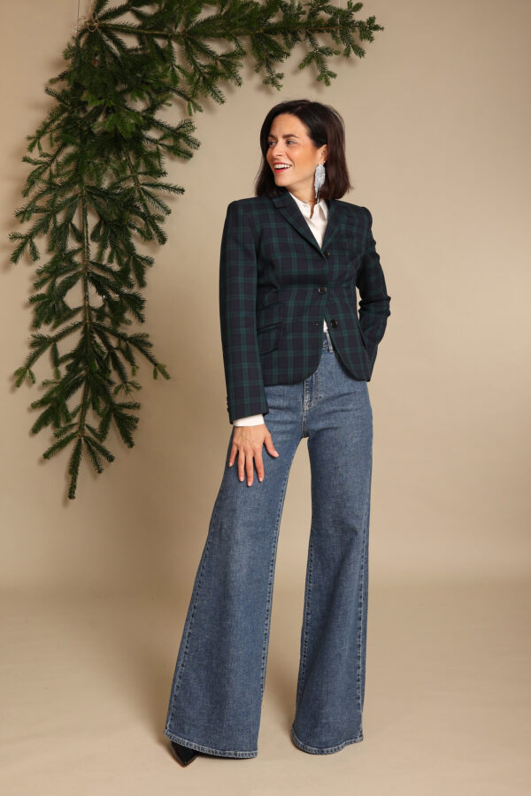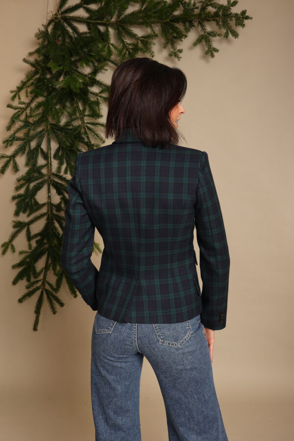 Giacca corta con vestibilità asciutta in tartan verde. Facilmente abbinabile ad un pantalone nero o ad un denim, forma un completo favoloso con il pantaloncino dello stesso tessuto.