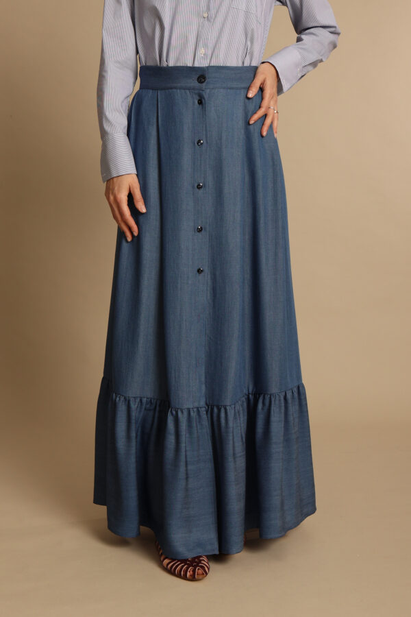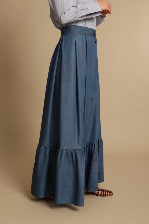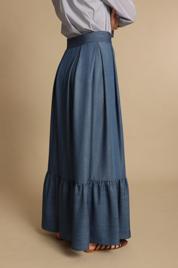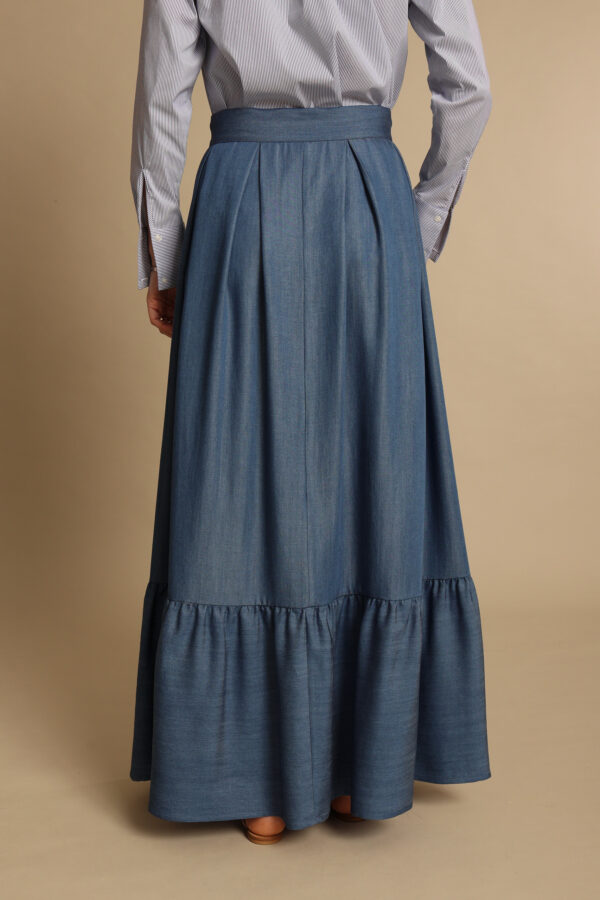 Gonna in cotone chambray color denim con abbottonatura fino in fondo e bellissima balza sul fondo. Sapienti pieghe sono state posizionate tutt’ intono per evitare che il tessuto creasse un effetto palloncino, poco donante, riuscendo così a  creare il movimento perfetto mantenendo il tessuto piatto per valorizzare la silhouette.