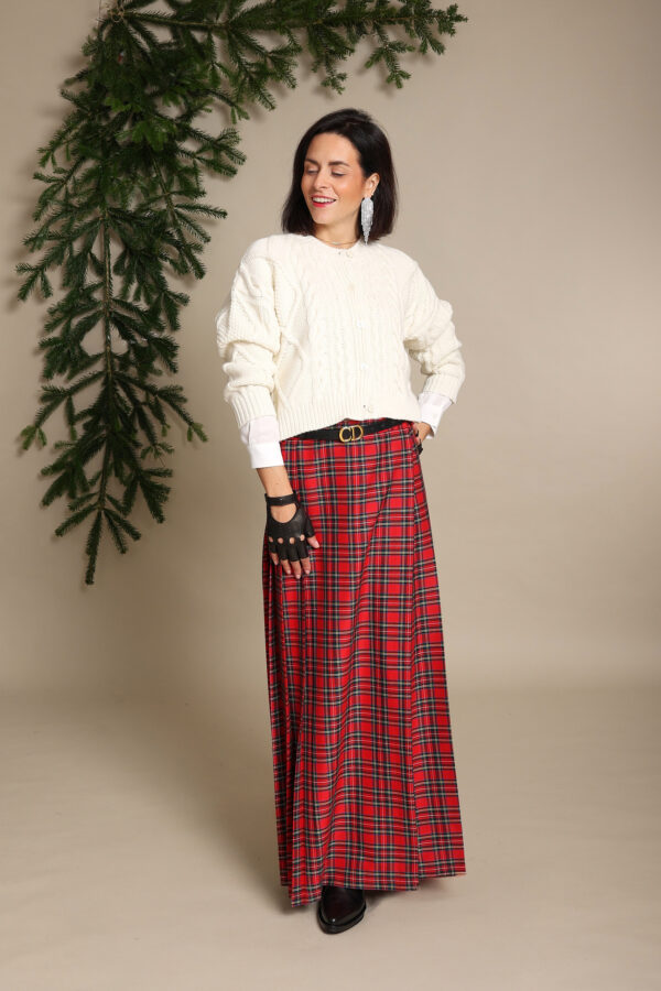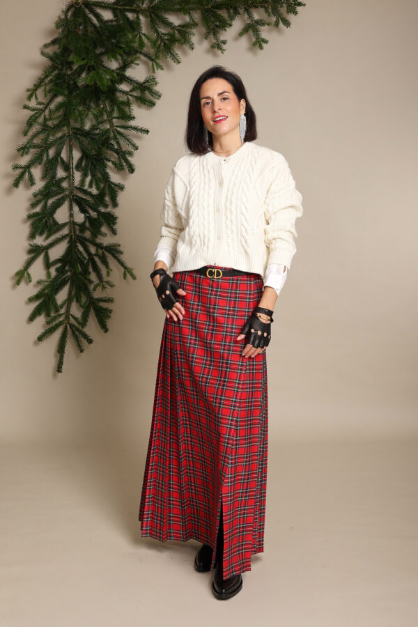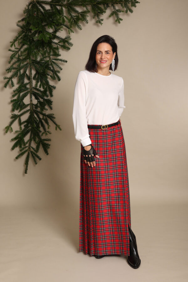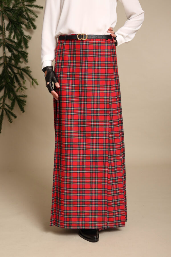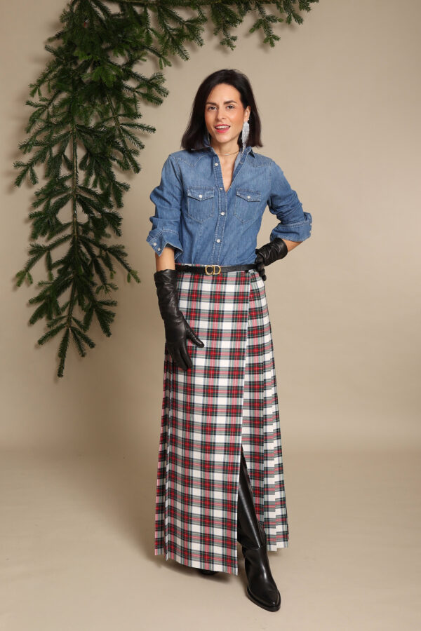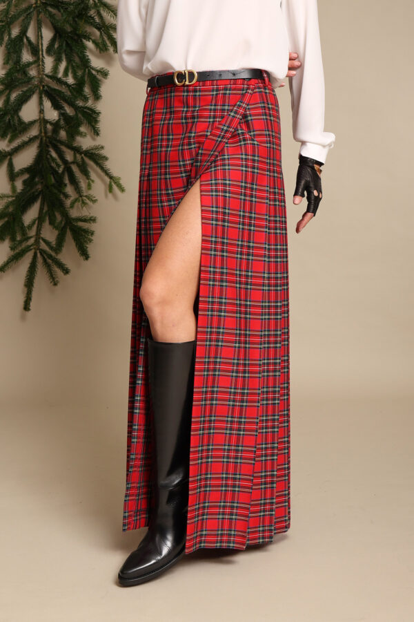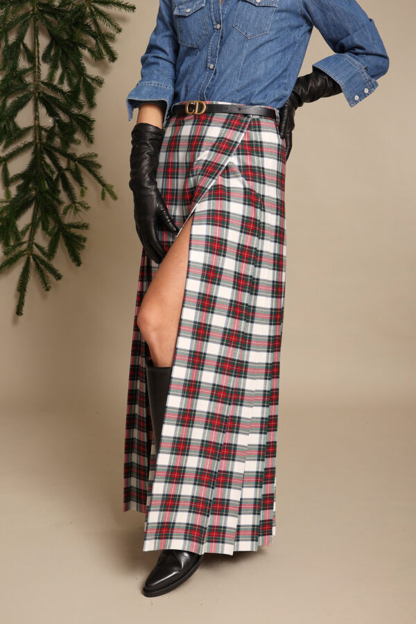 Un pezzo meraviglioso, una gonna lunga con chiusura a portafoglio, composta da un pannello centrale chiuso con 2 bottoni. Nelle parti laterali sono state sapientemente create delle pieghe per regalare un magico movimento al tessuto. La gonna si appoggia in vita.