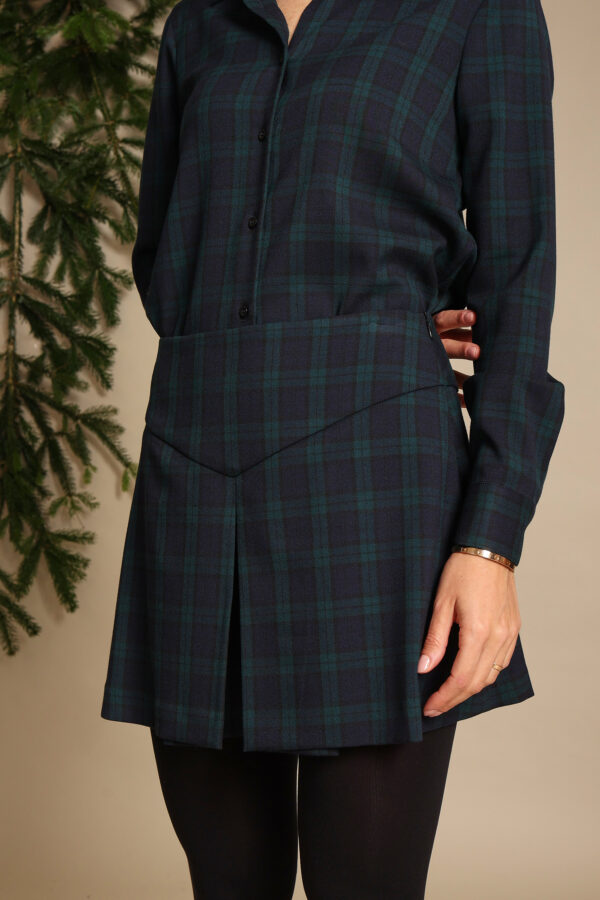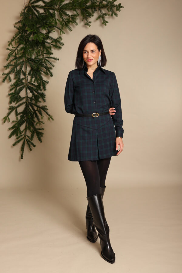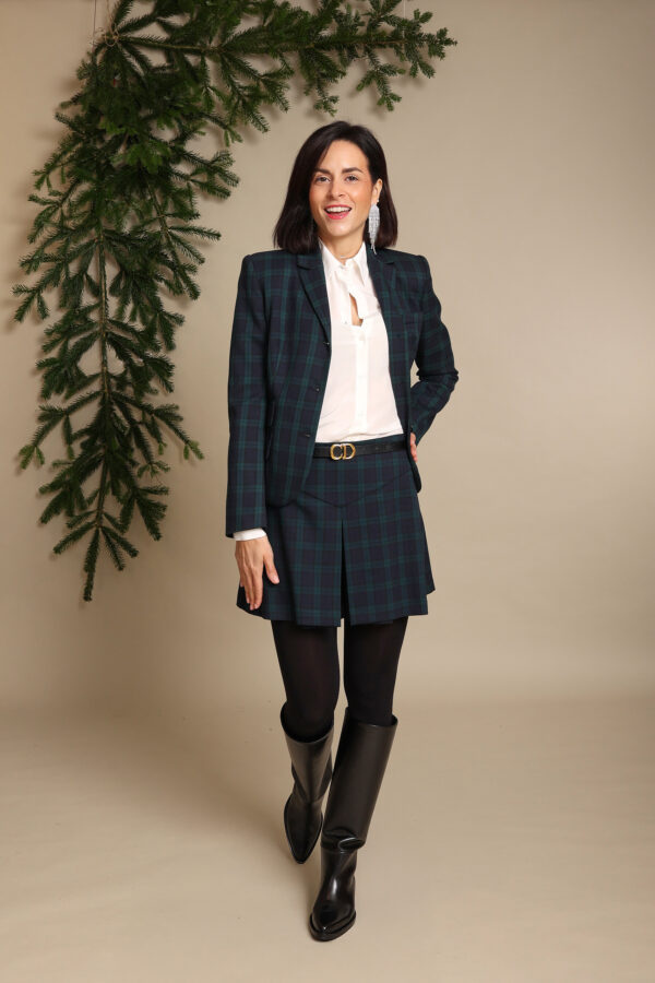Un pantaloncino in tartan con linea svasata che si apre ai lati. Perfetto con la camicia bianca, nera, o in tartan verde per creare un effetto abitino. E’ disponibile anche la giacca in entrambe le fantasie.