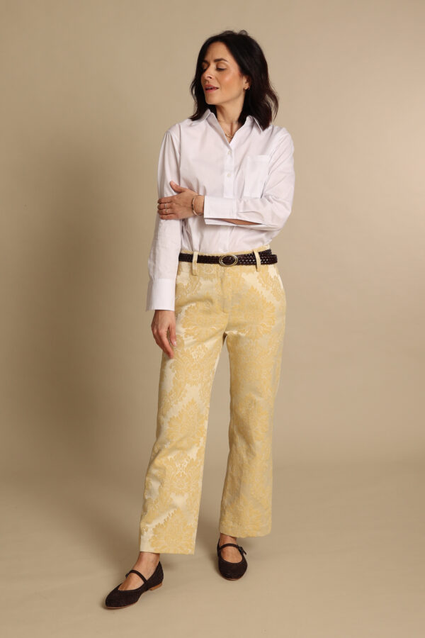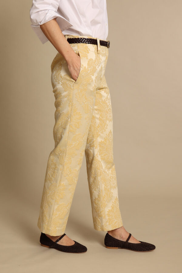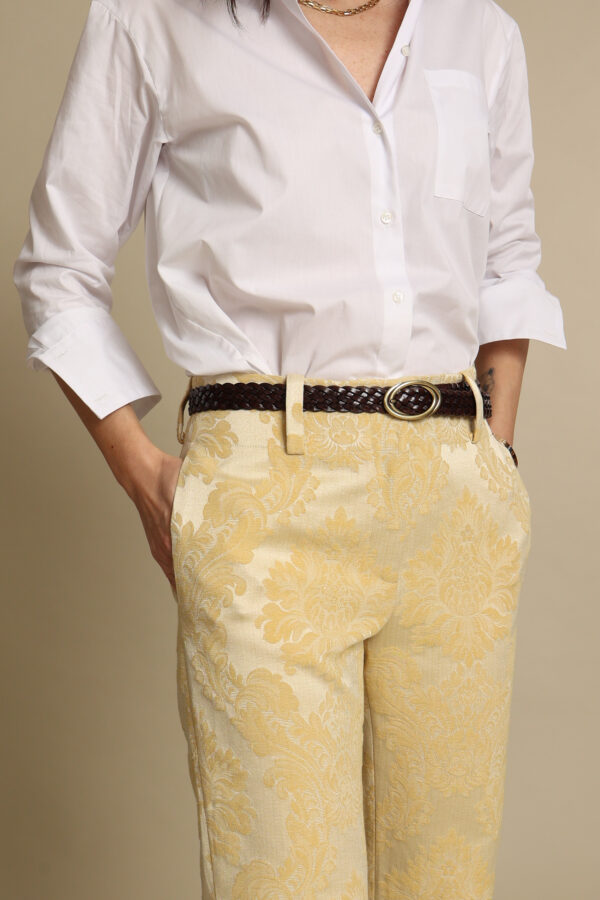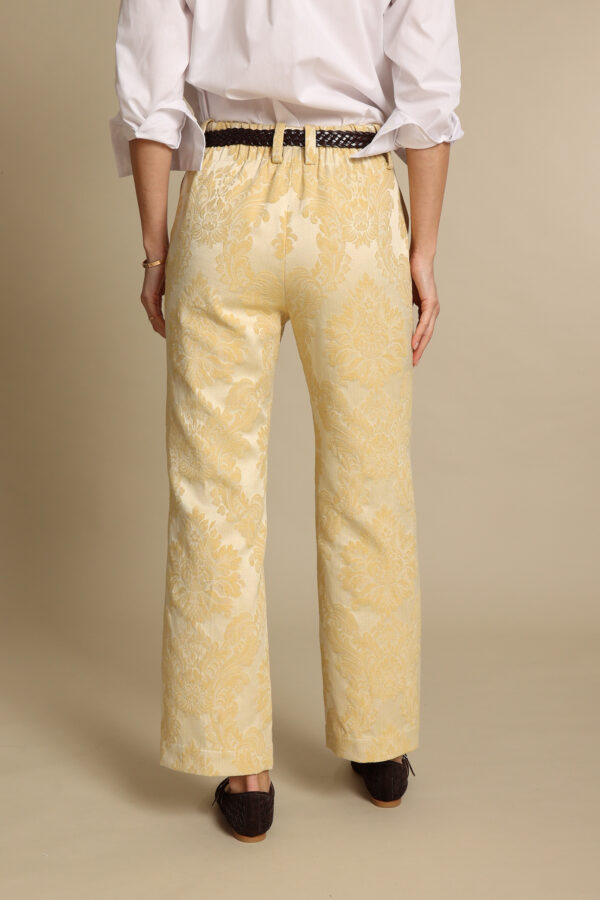Pantalone culotte con gamba dritta in prezioso tessuto broccato con elastico dietro, bottone e zip davanti, tasche laterali. Ha una vestibilità morbida, si appoggia in vita ed è perfetto con tutti i modelli di calzature. E’ possibile lasciarlo lungo oppure accorciarlo alla caviglia. Disponibile in tanti bellissimi colori.