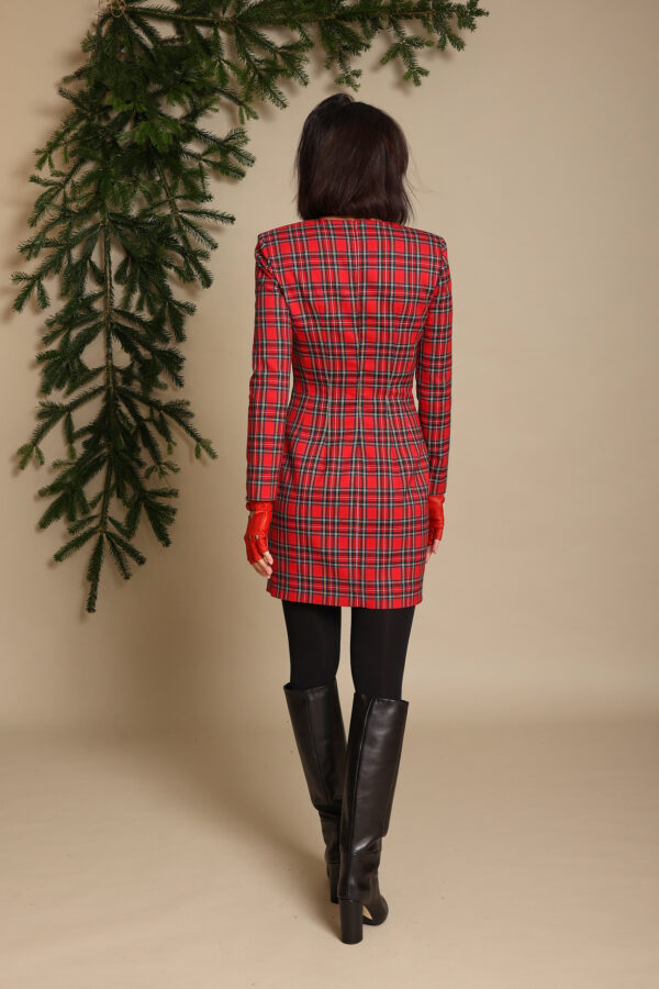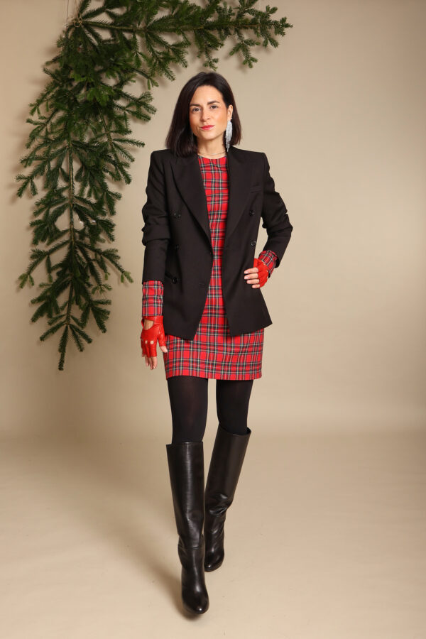 Un abito tubino in tartan rosso, dalla vestibilità asciutta con tagli sartoriali che slanciano la silhouette. La spallina leggermente imbottita aiuta a valorizzare ogni fisicità.